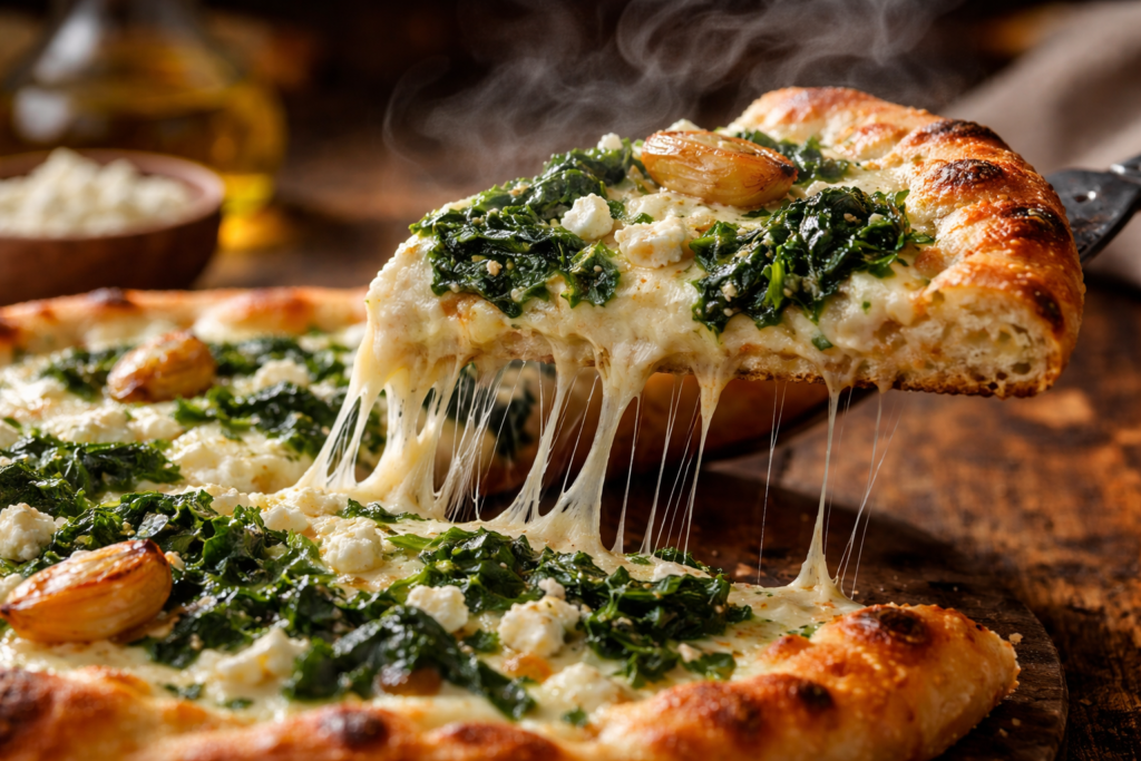Roasted garlic is the star here. When garlic roasts, it turns soft, sweet, and slightly caramelized. That mellow flavor pairs perfectly with fresh spinach and tangy feta. The result is a pizza that feels a little gourmet but is still simple enough for a weeknight dinner.