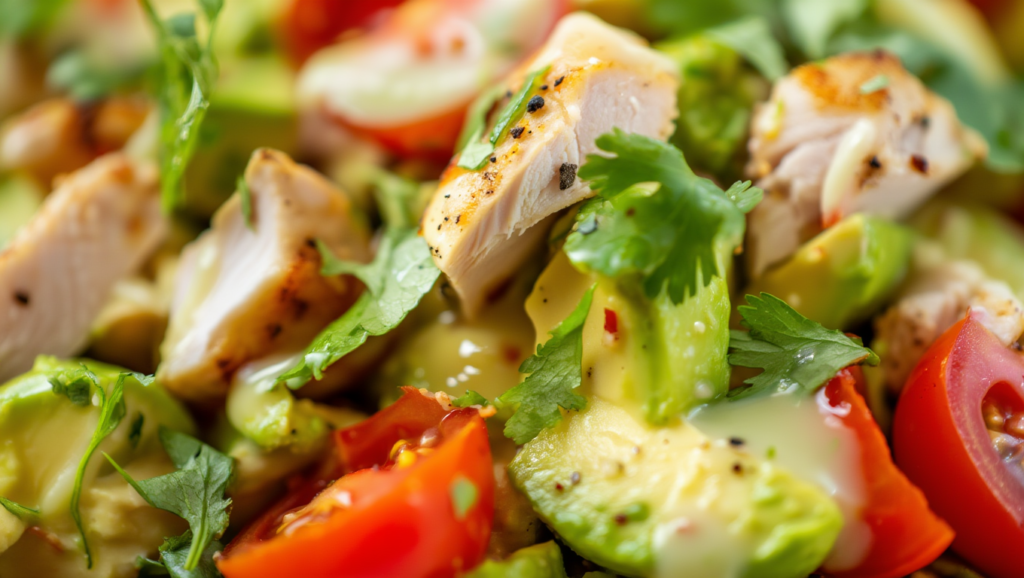 The grilled chicken brings that slightly smoky, savory bite. Ripe avocado adds a smooth, buttery texture that coats everything beautifully. Then you’ve got juicy cherry tomatoes and crisp cucumber for balance. Every forkful has something going on.