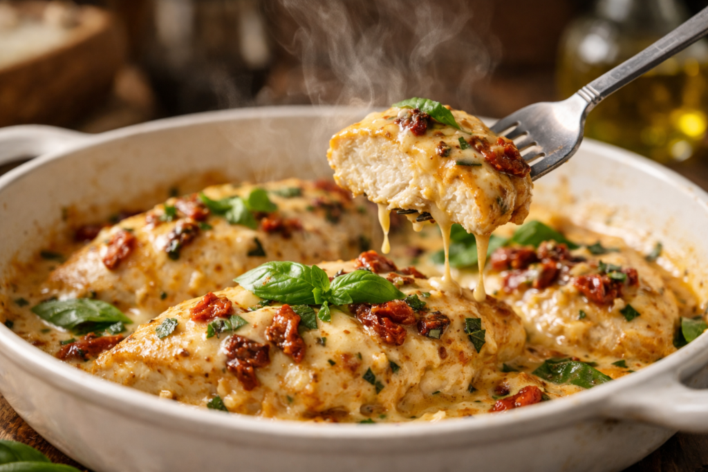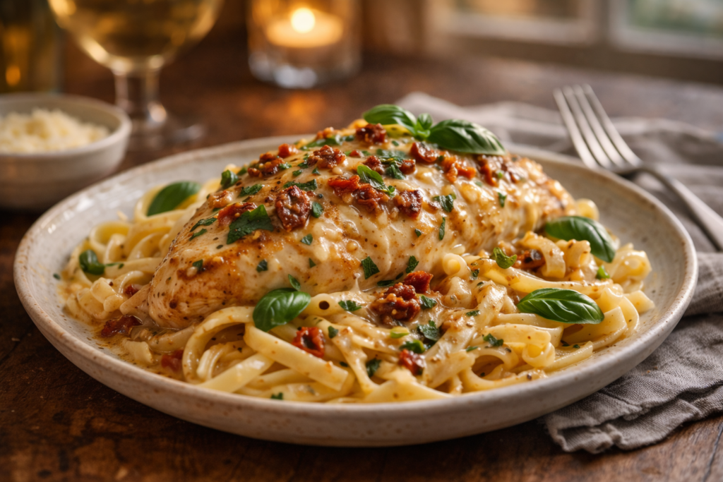 It’s typically made with chicken breasts cooked in a creamy garlic sauce with sun-dried tomatoes, herbs, and parmesan cheese.